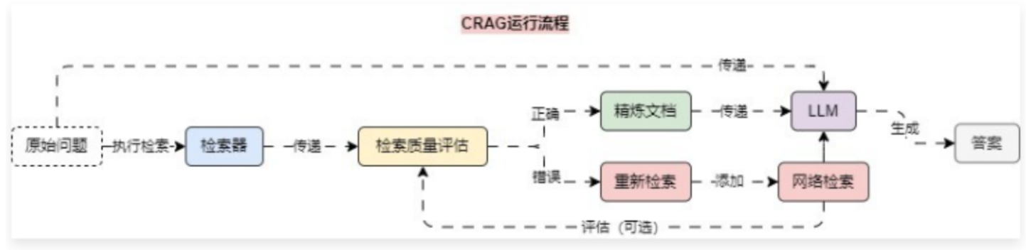 在前面的课时中,我们学习了 CRAG(纠正性索引增强生成) 优化策略,在该优化策略中引入了一个轻量级的评估器用于评估检索到的文档的质量,并根据评估结果触发不同的知识检索动作,其整体运行流程如下: