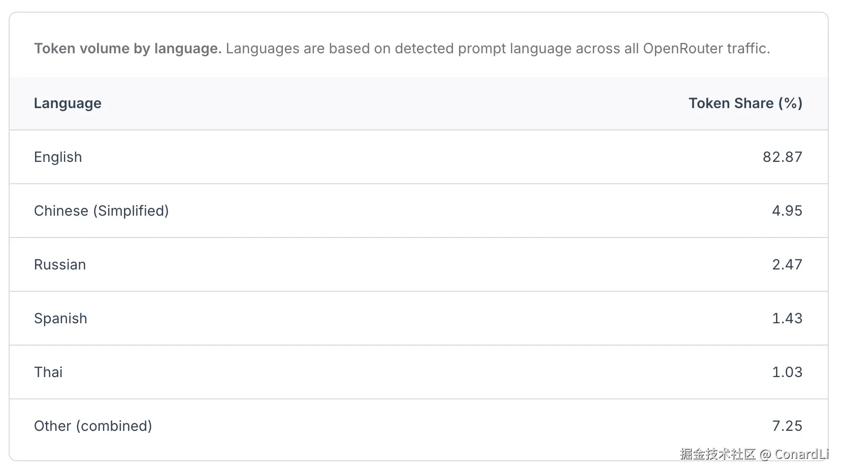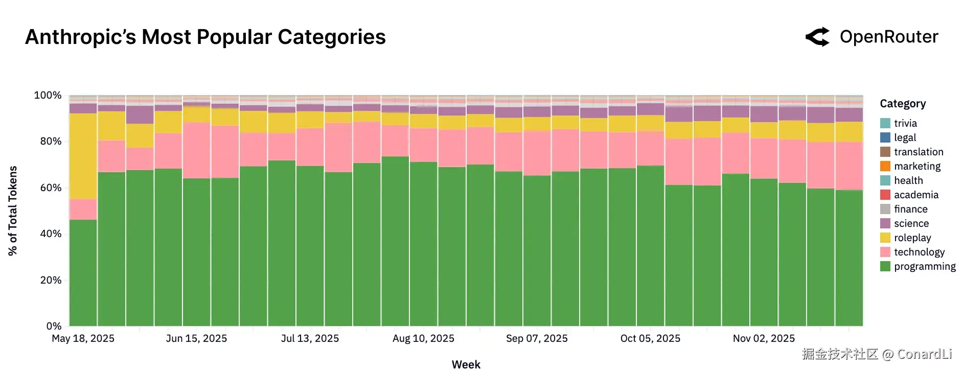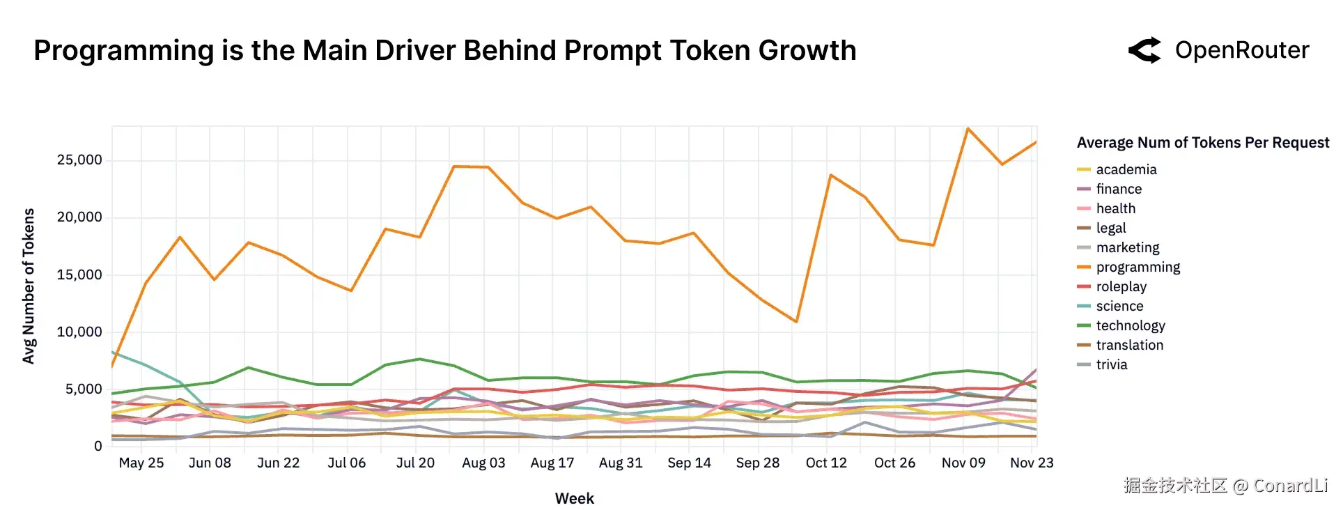 如果把视野从开源模型扩大到所有 LLM(包含闭源),编程无疑是增长最快且最具统治力的类别。从 2025 年初仅占约 11% 的份额,飙升至最近的超过 50%。这说明 AI 已经深度嵌入到写代码、调试等开发流程中,不再只是陪聊,而是实打实的生产力工具。
