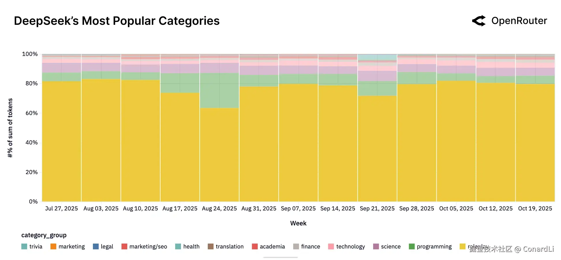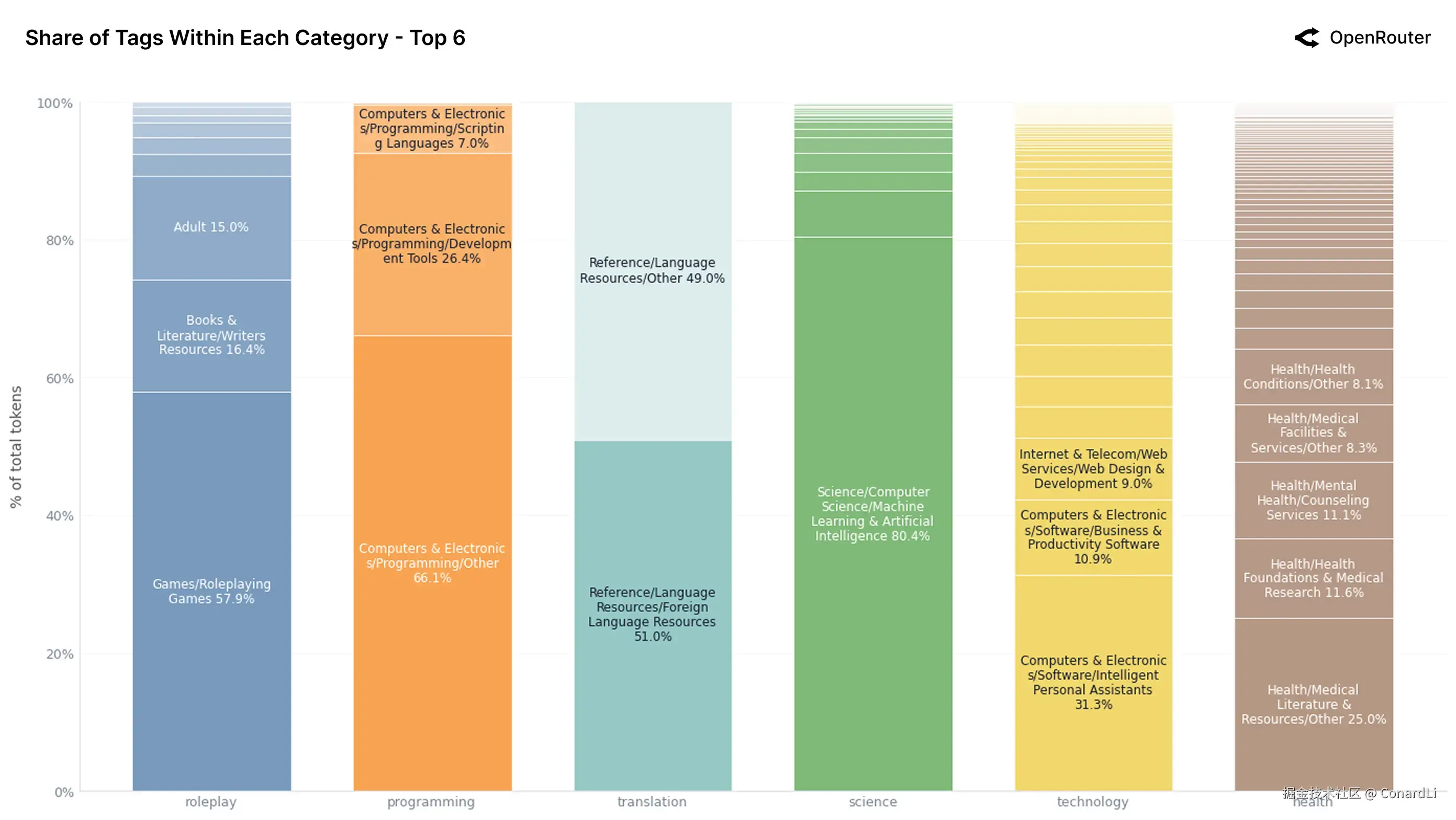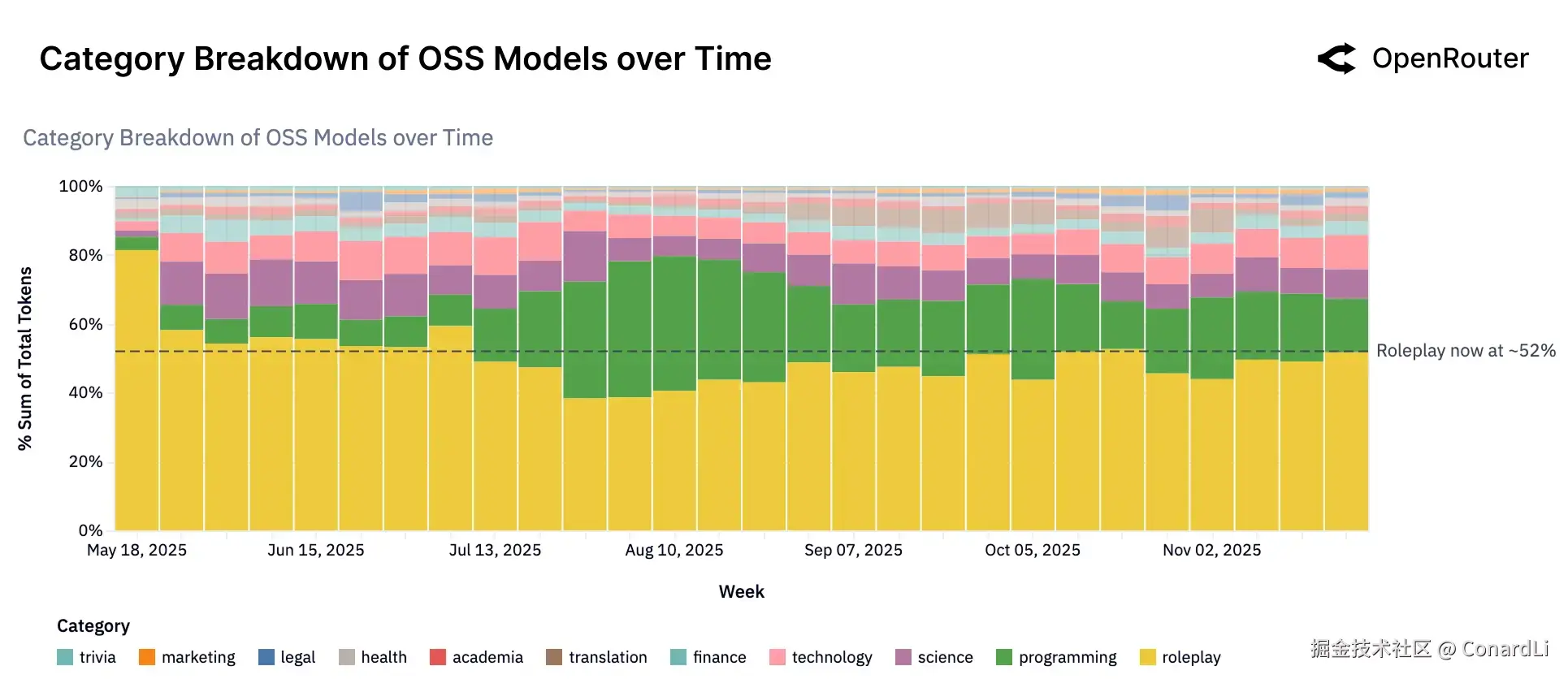 目前的开源模型并非雨露均沾,而是集中在角色扮演(Roleplay)和编程辅助这两个领域。这两类任务占据了绝大多数的 Token 用量。尤其是角色扮演,占据了总流量的半壁江山(超过 50%),这主要是因为开源模型通常受到的内容审查限制较少,更适合需要创意、情感互动或个性化定制的娱乐场景。