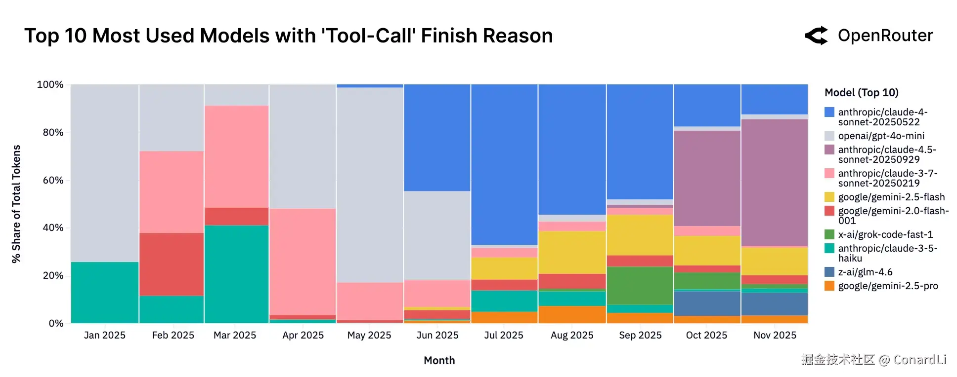 在 2025 年初,工具调用领域基本被 OpenAI(gpt-4o-mini)和 Anthropic(Claude 3.5/3.7 系列)垄断。但到了下半年,局面发生了显著变化:Claude 4.5 Sonnet 迅速抢占市场份额,同时 Grok Code Fast 和 GLM 4.5 等新模型也强势入局。这表明支持 Agent 能力的底层模型选择变得更加丰富了。