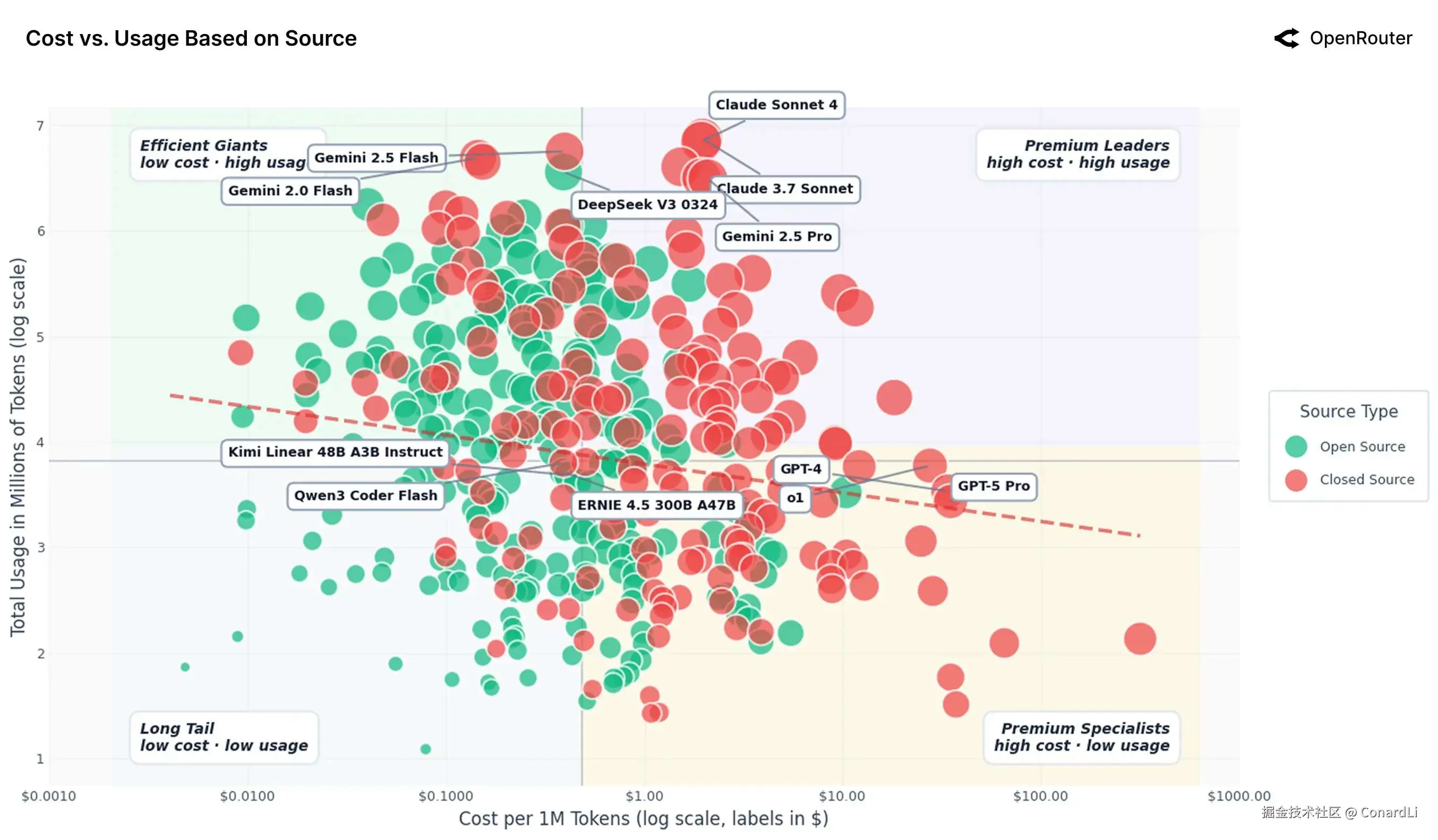 - 高价爆款(Premium Leaders): 比如 Claude Sonnet 系列。虽然价格不菲(约 $2/百万 token),但用量巨大。说明只要模型足够好、足够稳,用户是愿意掏钱的。