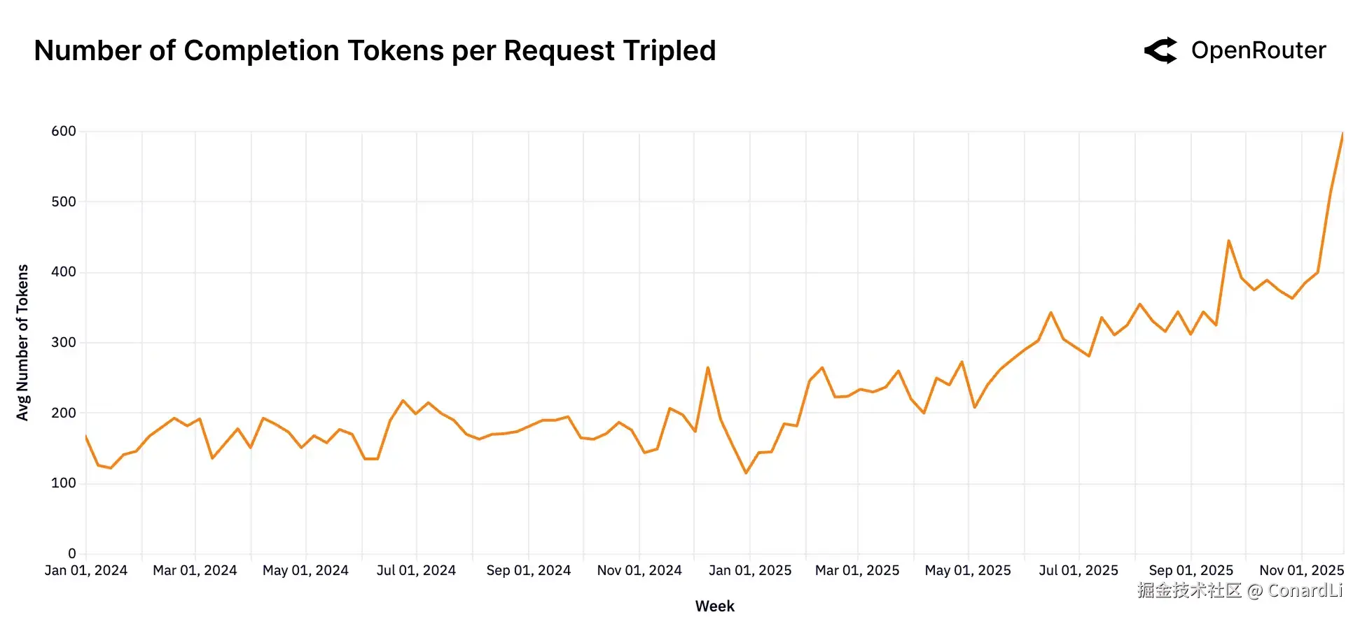 过去一年,用户输入的提示词(Prompt)平均长度 翻了近 4 倍(从约 1.5k 涨至 6k token),而模型输出的长度虽然也增加了 3 倍(主要归因于推理过程),但绝对值依然较小。这说明现在的交互模式是"喂给模型大量信息,换取精炼的高价值洞察"。