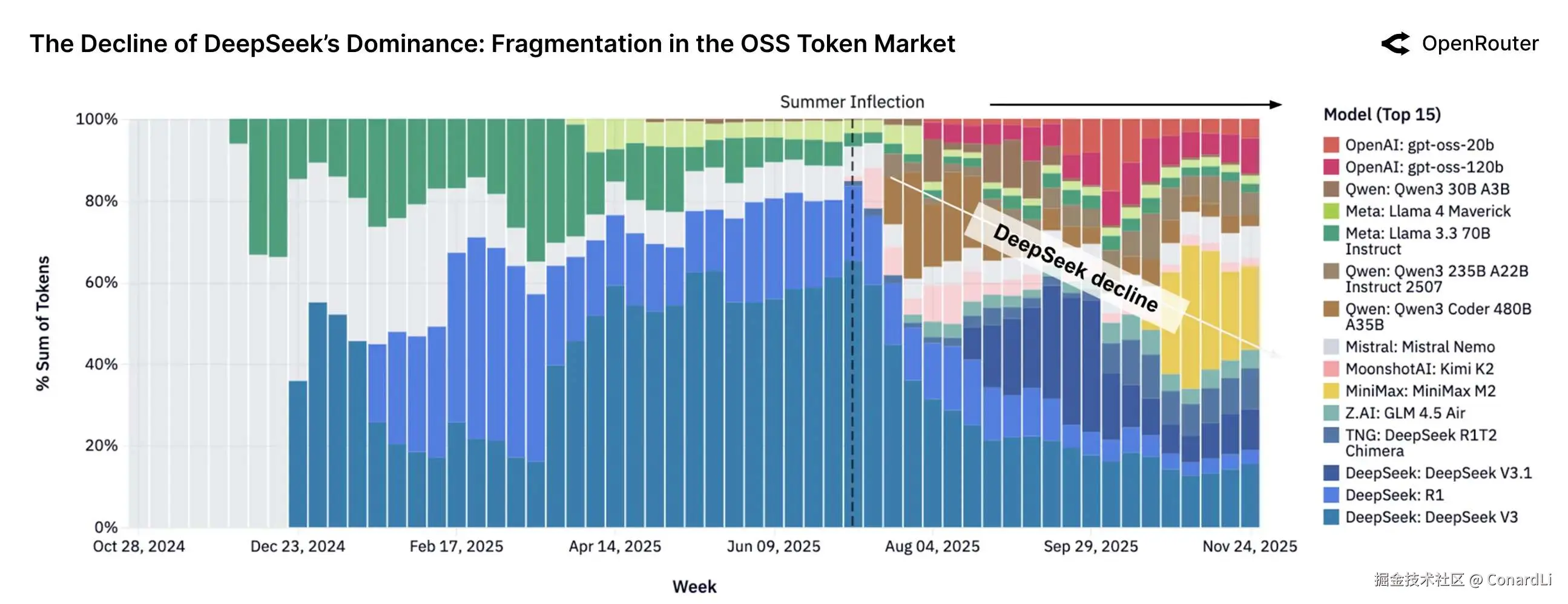 开源模型市场在过去一年发生了剧变。虽然 DeepSeek 在总流量上依然领先,但它曾经占据"半壁江山"(超过 50%)的统治地位已被打破。到了 2025 年底,没有任何单一模型能独占超过