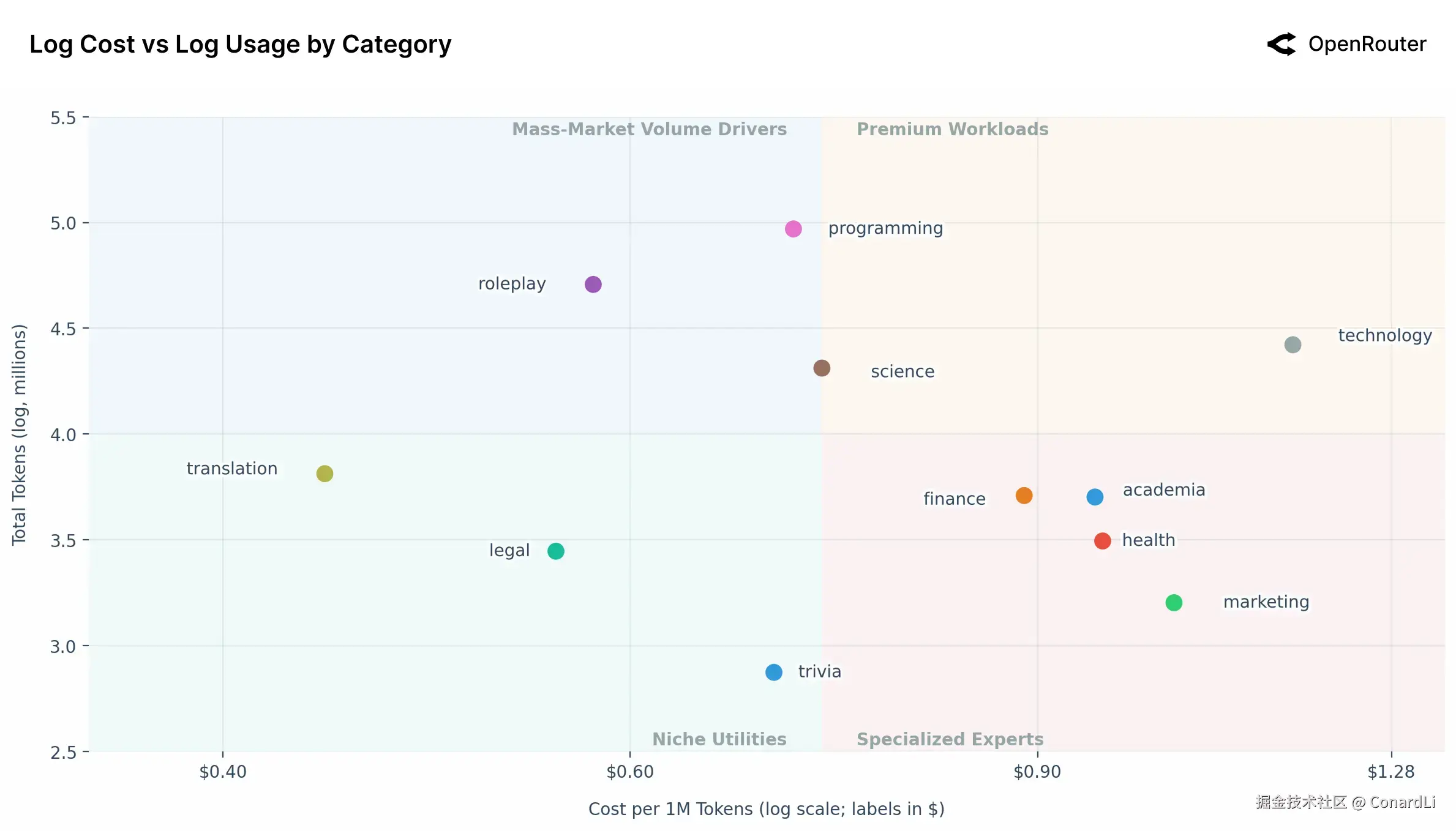 翻译和法律:低价且低频 翻译、法律常识和冷知识问答属于低成本、低流量区域。这说明这类任务已经被"商品化"了,技术门槛不高,用户觉得用便宜的模型随便跑跑就够用了,不需要花大价钱。