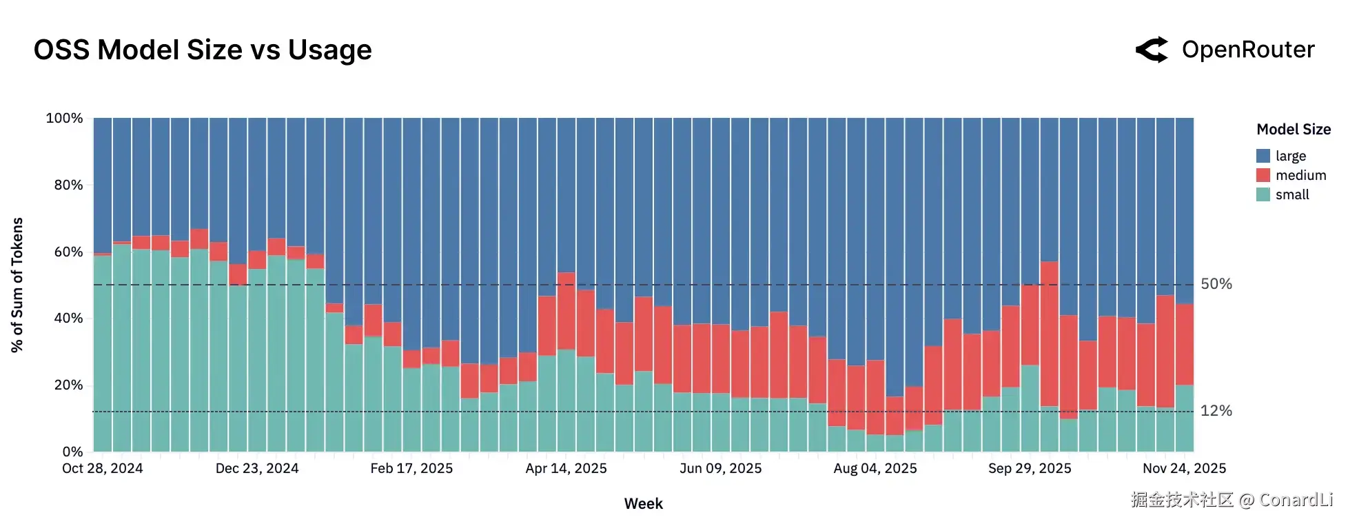 虽然市面上不断涌现新的小模型(15B 参数以下),但它们的使用份额反而在下降。这个赛道极其拥挤,用户忠诚度很低,总是在不断尝试新出的模型(如 Google Gemma 3 等),导致没有任何一个小模型能长期坐稳位置。