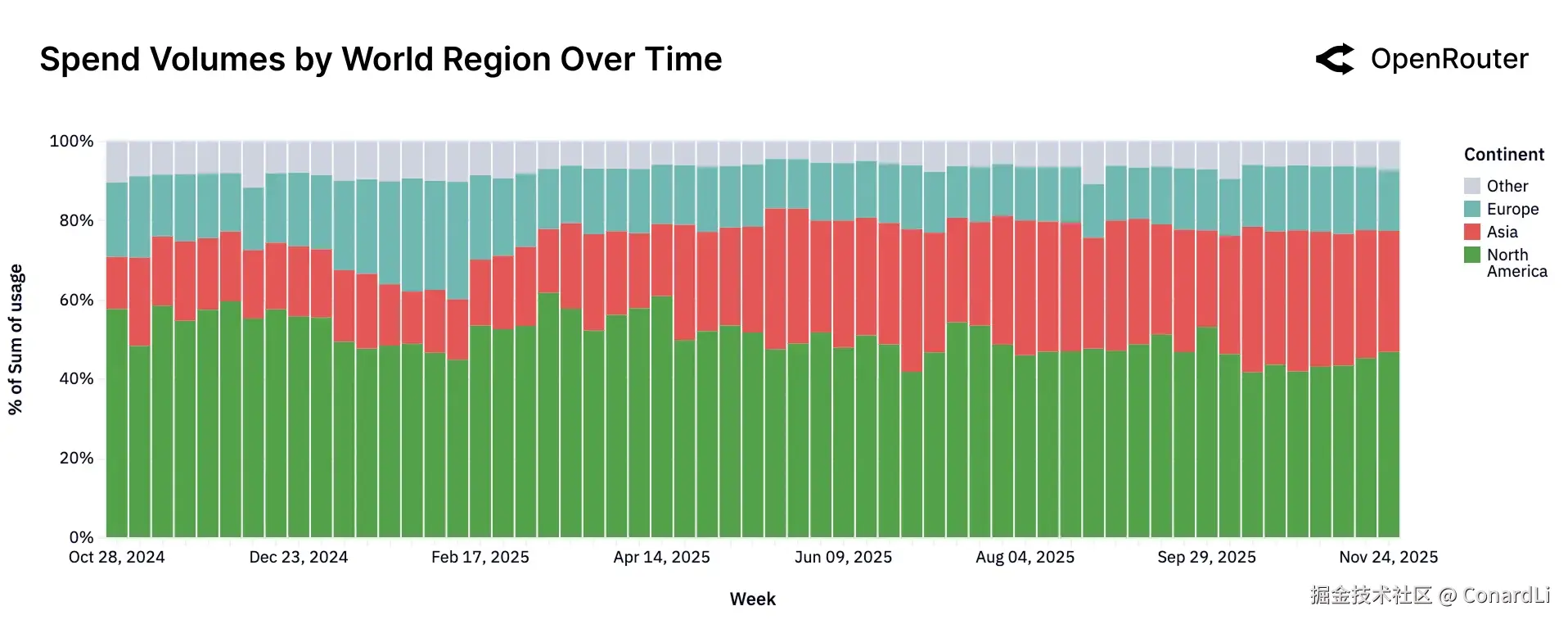 北美不再"一家独大",亚洲消费力翻倍 虽然北美依然是全球最大的 AI 消费市场(约占 47%),但其份额已不足全球总支出的一半。最引人注目的是亚洲的崛起 :亚洲不仅是模型的生产地,更是迅猛增长的消费地,其市场份额从最初的 13% 飙升至 31%,实现了翻倍增长。