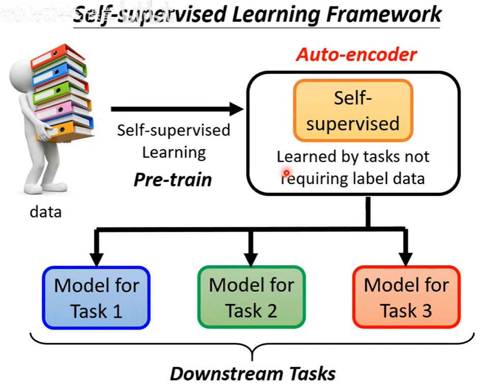 自编码器通常被视为自监督学习的一种实现方式。为便于理解其背景,我们可简要回顾自监督学习的一般流程:首先利用大量无标签数据,通过设计如"填空"、预测下一单元等预训练任务,使模型学习数据中的潜在规律;待模型在此阶段训练完成后,即可通过微调迁移至各类下游任务中。