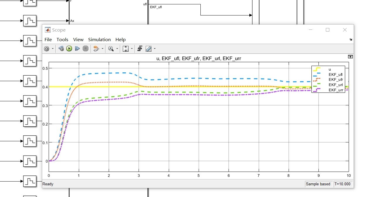 基于simulink的拓展卡尔曼滤波的估计路面附着系数估算,ekf算法基于matlab 内含道夫轮胎模型,七自由度车辆模型,非carsim联合仿真,运行结果如下各个输出收敛,效果不错