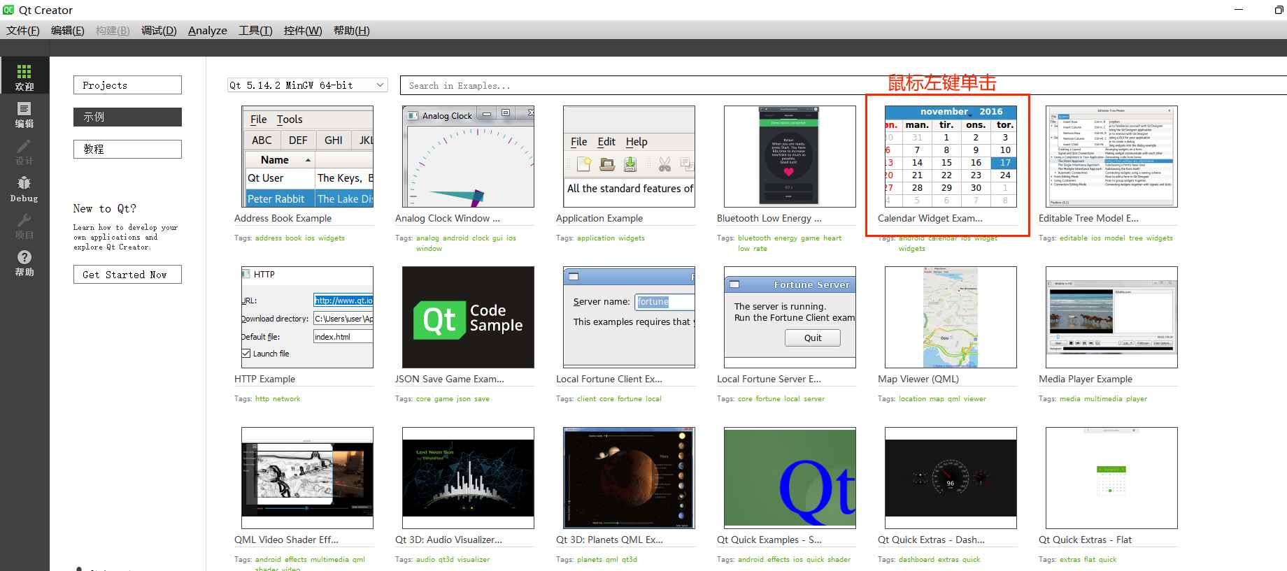 1、双击打开 Qt Creator ⼯具,并进⼊到** "欢迎模式"** 下的 **"⽰例" **界⾯;