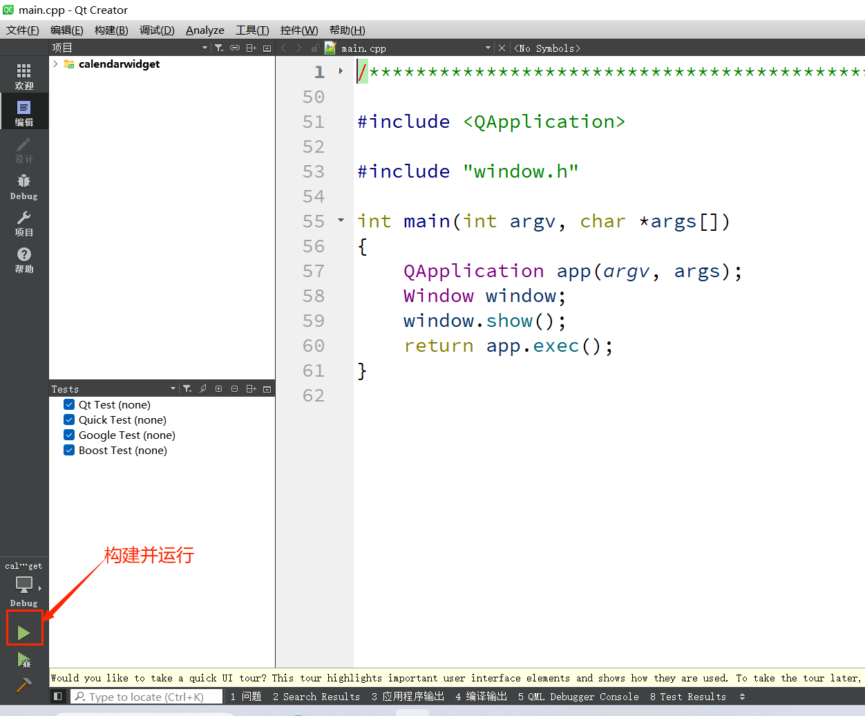 | 帮助 | 包含 Qt 帮助、Qt Creator 版本信息、报告bug和插件管理等菜单。 |