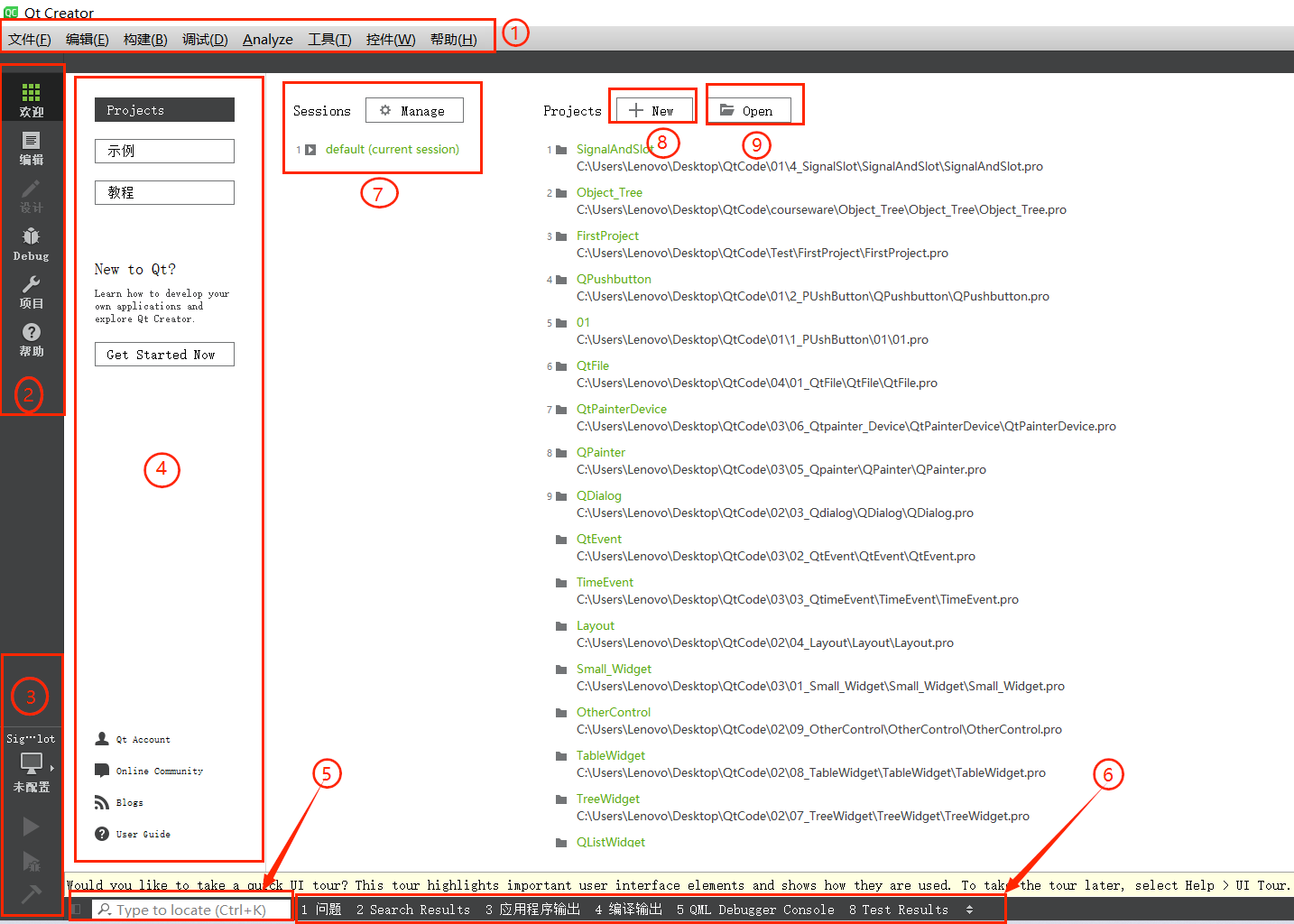 欢迎模式:主要提供了⼀些功能的快捷⼊⼝,如打开帮助教程、打开⽰例程序、打开项⽬、新建项⽬、快速打开以前的项⽬和会话、联⽹查看 Qt 官⽅论坛和博客等。⽰例⻚⾯显⽰了 Qt ⾃带的⼤量⽰例程序,并提供了搜索栏从⽽实现快速查找;教程⻚⾯提供了⼀些视频教程资源,但是是英⽂的。