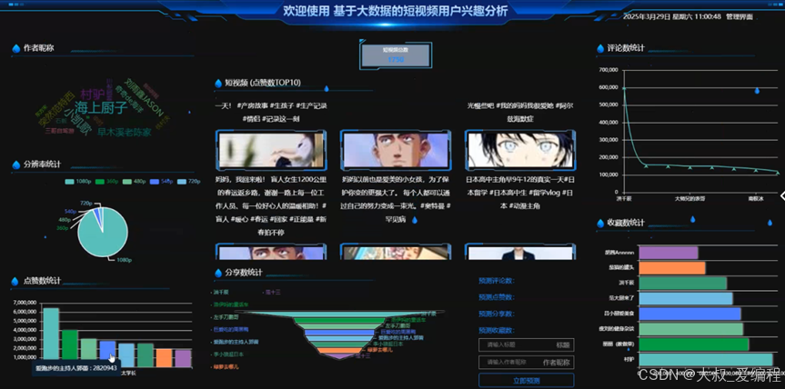 管理员成功登录系统后,将拥有广泛的权限,能够管理多个功能模块,包括但不限于系统首页、个人中心、短视频、短视频预测等管理。短视频用户兴趣分析看板展示,作者信息:展示了诸如村驴、海上厨子等作者昵称,呈现创作者群体。视频数量:明确标注短视频总数为1750条,体现内容规模。视频热度:列出点赞数TOP10短视频,如妈妈,我回来啦等,附带话题标签,直观呈现热门内容。分辨率:通过饼图展示,1080p占比最大,其余360p、480p等有相应占比,反映视频画质分布。点赞数统计:以柱状图呈现,爱跑步的主持人郭靖等创作者点赞数清晰可见。评论数统计:折线图展示,部分视频评论数变化趋势一目了然。分享数统计:采用特殊图表,展示洪千辰等创作者分享情况。收藏数统计:柱状图呈现,胡茜Annnnn等创作者收藏数据可辨。还设有预测数据区域,可输入标题和作者昵称查询预测的评论、点赞等数据。