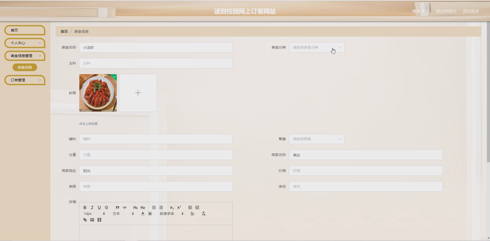 美食信息模块:商家可添加美食信息(名称、图片、详情、价格、库存、所属分类)、编辑与下架菜品;前端实现美食列表展示(支持按销量、评分、价格排序)、美食详情页(包含用户评价、相关推荐)等功能,同时提供搜索功能,方便用户快速查找目标美食。