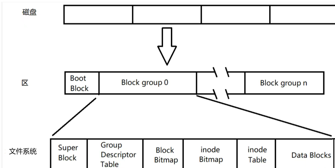 **1.Data Blocks:**存储文件内容的位置,里面就是一个一个的块,存储文件的内容,一般来说一块的大小是4kb,可以查看Block Bitmap的大小来查看有多少块,来决定占据了多少个扇形。