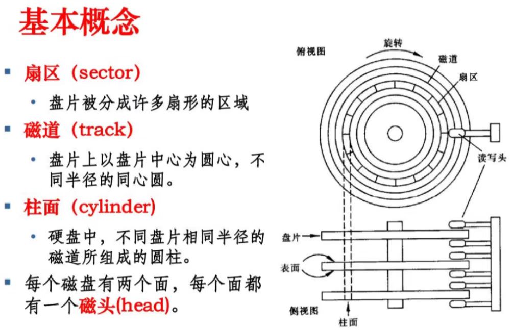 - 盘片:一片两面,每一面都可以存储数据,有一摞盘片