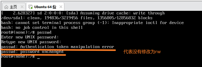 如果一开始没有将ro改成rw,就会报以下错误,但也不用重新上述步骤,只需要输入mount -o remount,rw / 就行,接着继续输入passwd就行;