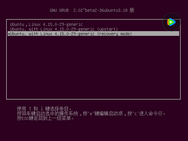 然后按回车键进入,选带 (recovery mode) 的内核,按回车键进入