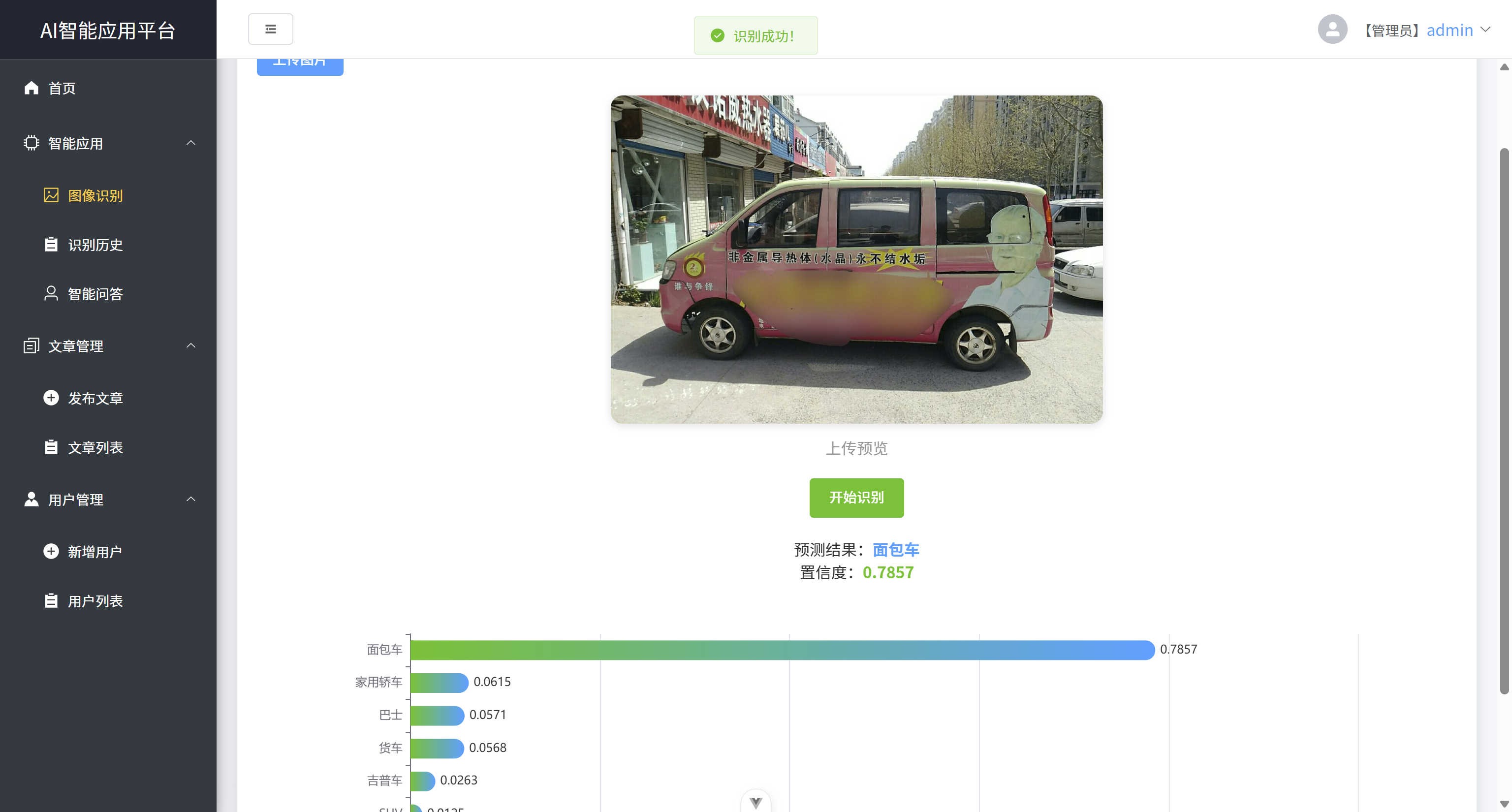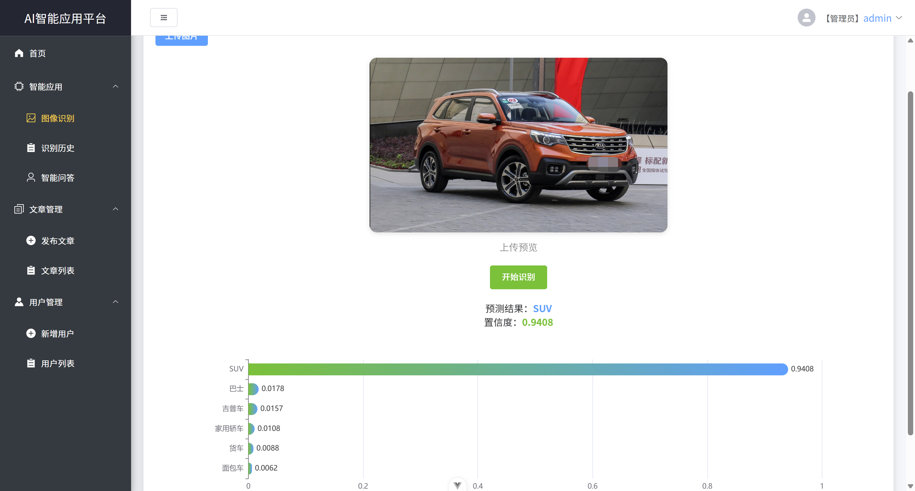 - 在图像识别功能中,用户上传图片后,点击识别,可输出其识别结果和置信度
