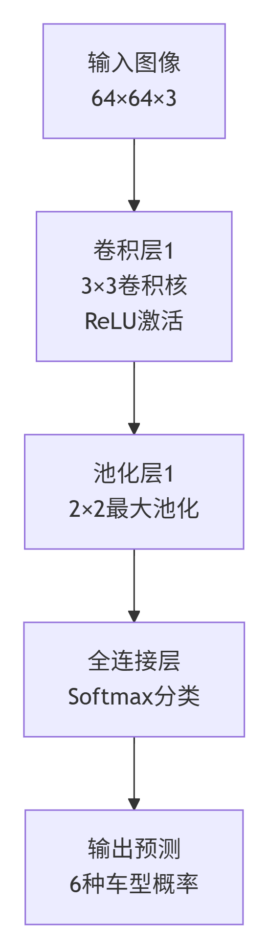 该CNN模型首先通过卷积层提取图像局部特征,经池化层降维保留关键信息,最后由全连接层完成分类决策,输出六类车型的识别概率分布。这种层级结构使网络能够从低级特征逐步学习到高级语义表示,实现高效的图像识别功能。