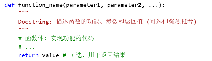 Docstring (文档字符串): 位于函数定义第一行的多行字符串(通常用三引号 """Docstring goes here""")。用于解释函数的作用、参数、返回值等。可以通过 help(function_name) 或 function_name.doc 查看。这个写法可选,为了后续维护和查看,建议加上这一段更加规范