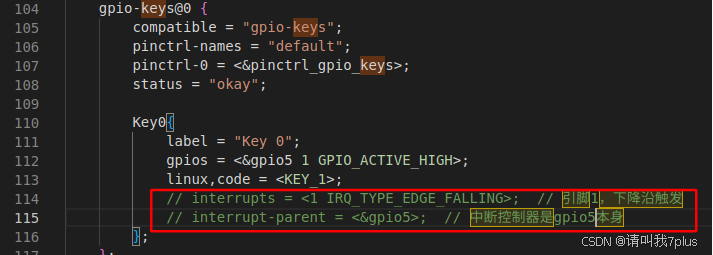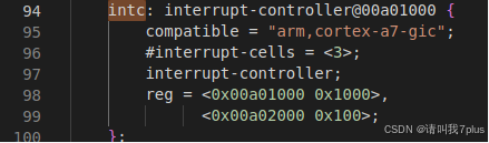 注意:在编写驱动时,我们不需要关心具体的中断父节点设置,只需要从设备树中获取中断号即可。设备树中的