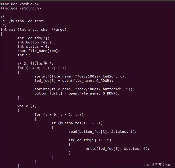 开发板中自带的代码就是以这种方式实现的,通过不断查询按键设备节点的状态,检测有变化时去设置led灯的状态。