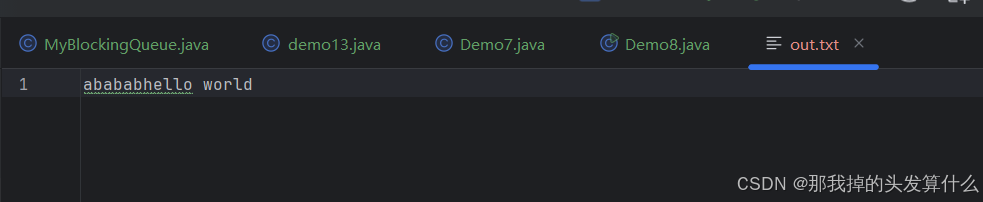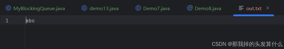 如果我们多次运行程序,out.txt文件中仍然是abc,说明,写文件时并不是向文件中直接写入数据,而是先将原来的数据清除,再写入新的数据。此时是覆盖模式。
