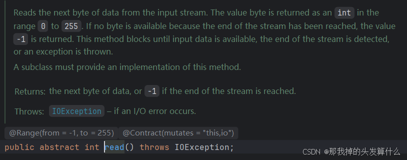read的实际输出是0-255之间的一个数字,此处使用int作为返回值的原因是可以使用-1表示读取完毕,而且byte类型范围有限,只能表示-128 - 127,并且java中没有类似于无符号类型的东西。
