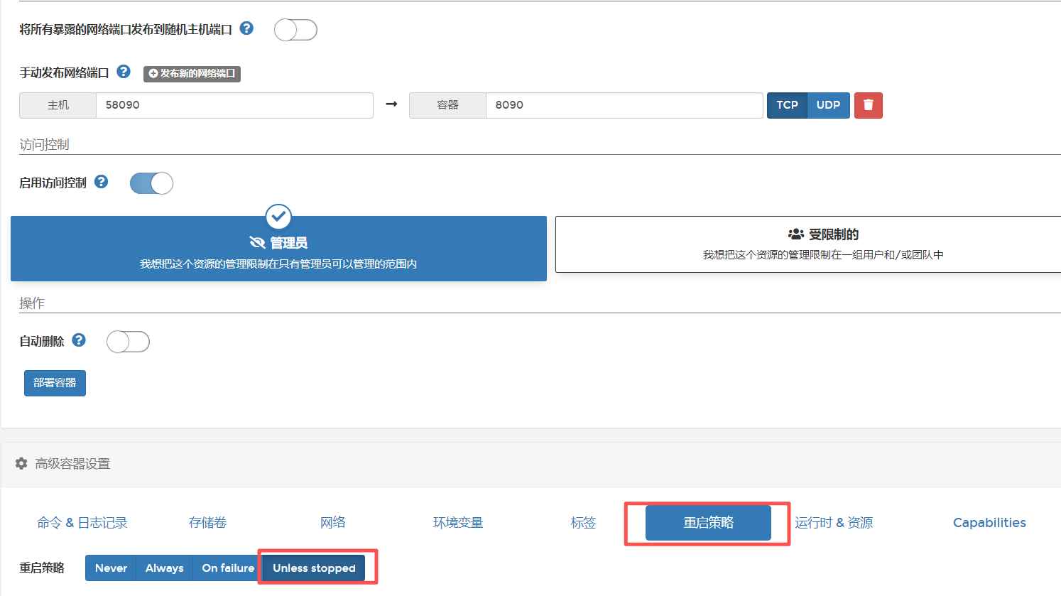在portainer中找到重启策略,选择unless stopped