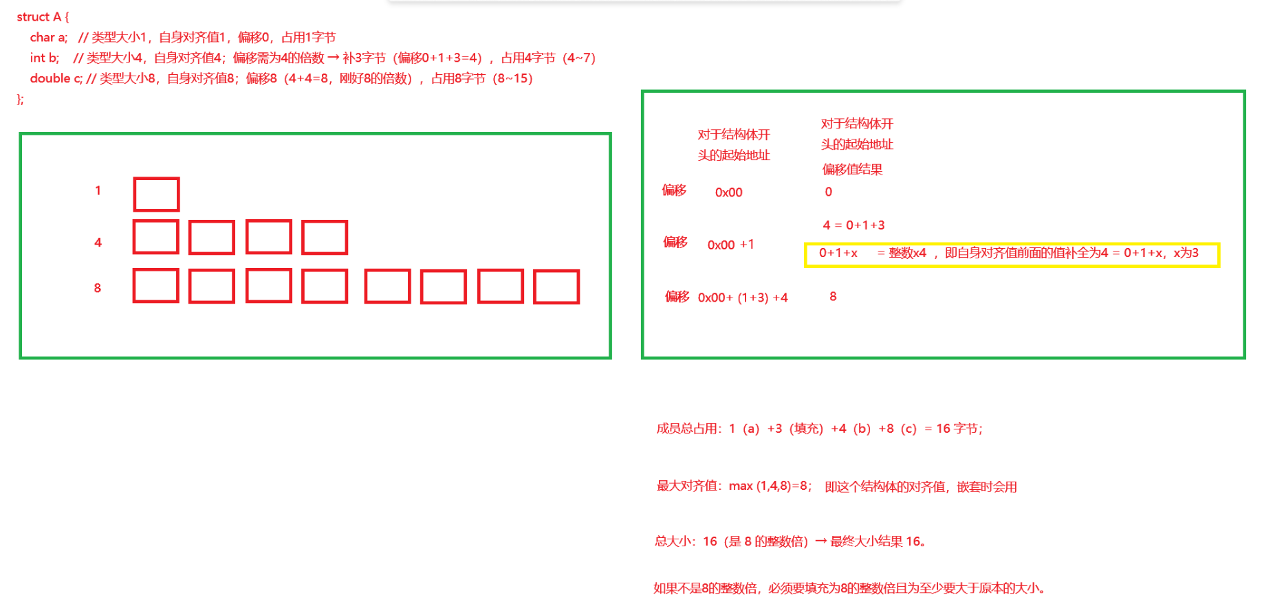 嵌套结构体规则:嵌套结构体的偏移量是其自身「最大对齐值」的整数倍;结构体整体的最大对齐值需包含嵌套结构体的最大对齐值。