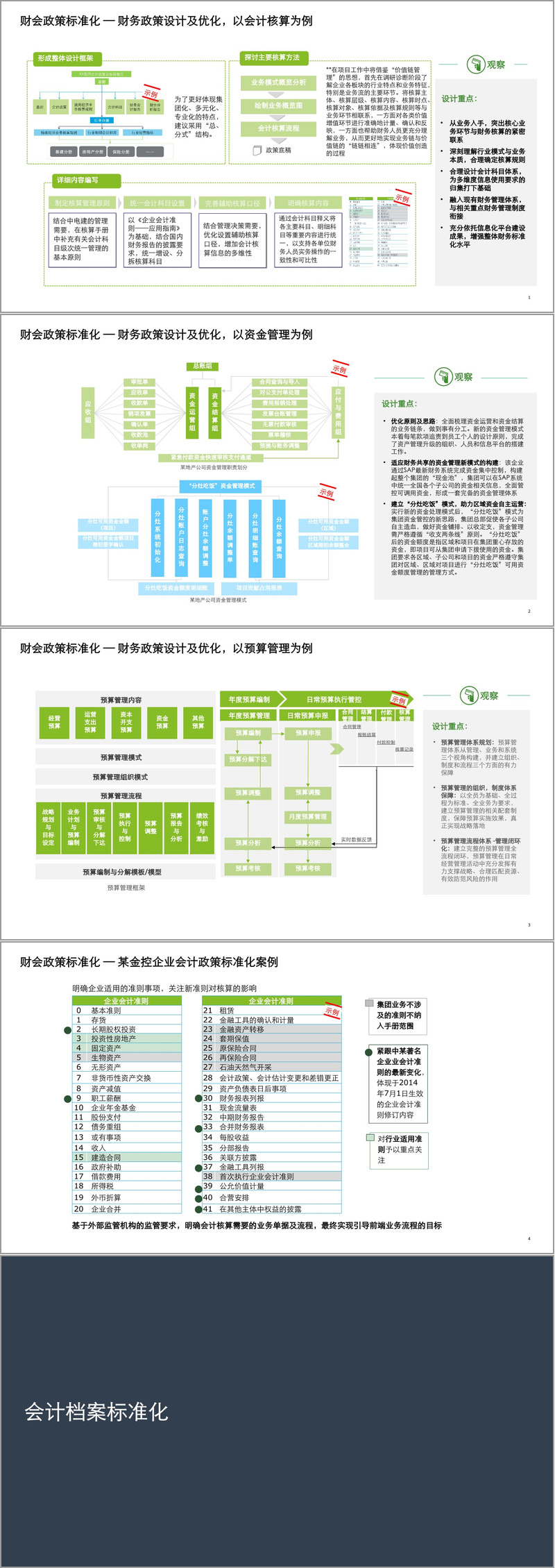 方案首先从会计科目核算标准化入手,提出统一集团会计准则、明确财务管理制度、规范前端业务行为三大目标。通过财会政策的标准化,为财务共享中心的定位与设计奠定基础,确保信息系统自动化的顺利实施。政策体系强调"支持管理、创造价值",兼具合规性、标准化、先进性与实用性,并充分考虑不同行业的业务特点,实现差异化处理。