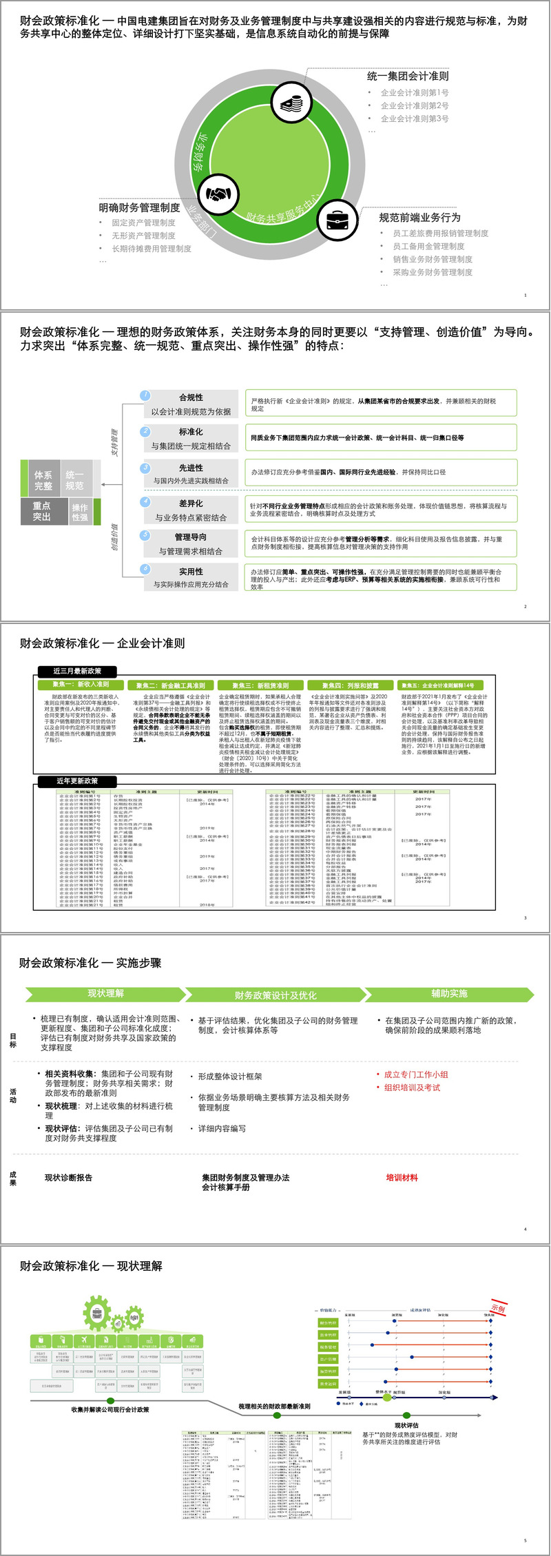 在财会政策标准化部分,方案聚焦新收入准则、新金融工具准则、新租赁准则等近年更新的会计准则,并结合具体案例说明政策落地的方法。实施步骤包括现状理解、政策设计与优化、辅助实施三大阶段,通过诊断报告、制度修订、培训推广等方式,确保政策在集团与子公司范围内有效落地。