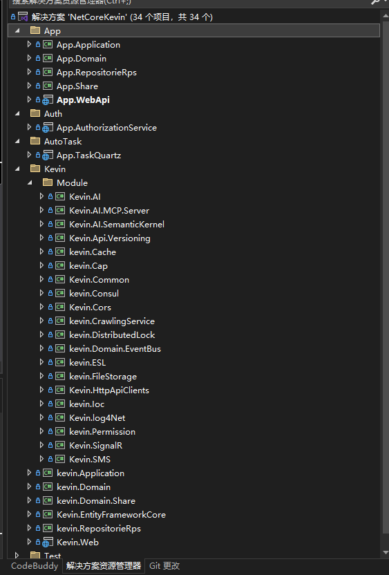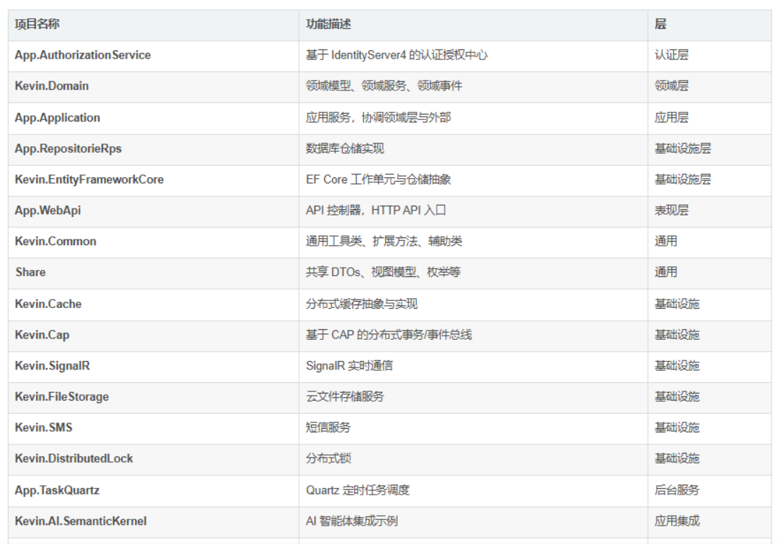 NetCoreKevin 是一个非常完整的微服务架构项目,结合了 DDD、CAP、Quartz、EFCore 等多种技术,并集成了 AI、OCR、短信、文件存储等实用功能。其模块化设计使每个功能都可以独立引用,非常适合大型企业级应用的开发。