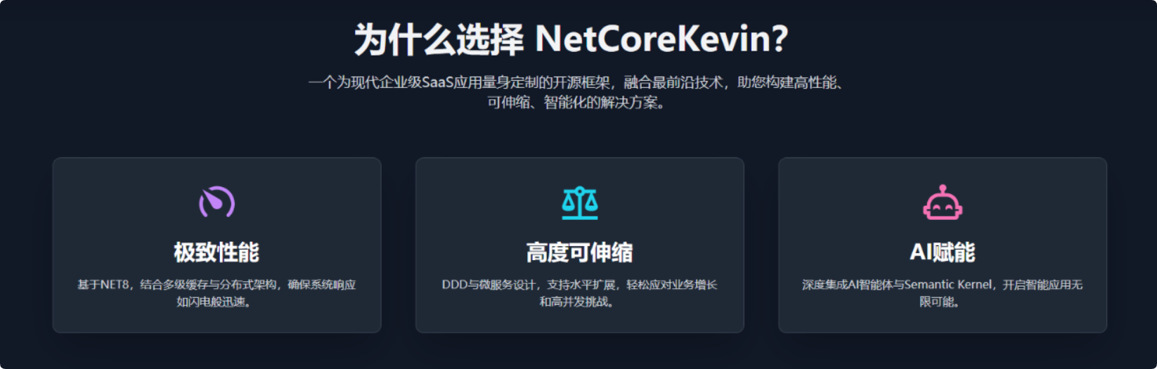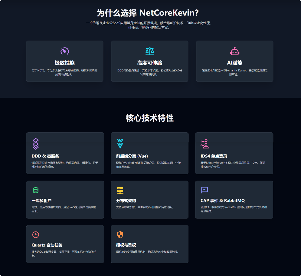 NetCoreKevin、.NET 8、DDD架构、微服务、AI集成、IdentityServer4、CAP事件总线、Quartz调度、Vue3前端、模块化设计、DDD、微服务、多租户、AI智能体、.NET8、Vue3、SignalR、Quartz、CAP、RAG