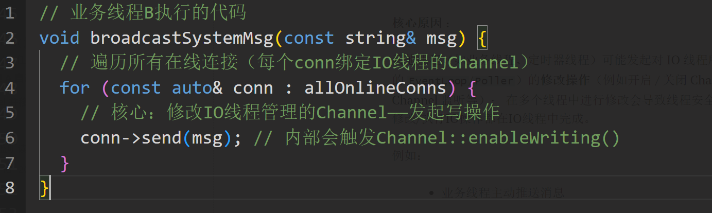 其他线程(如业务线程、定时器线程)可能发起对 IO 线程所属 Channel(及关联的 EventLoop/Poller)的修改操作(例如开启 / 关闭 Channel 读写事件、移除 Channel 监听等); 在多个线程中进行修改会导致线程安全等问题,因而强制所有修改/执行IO操作都在IO线程中完成。