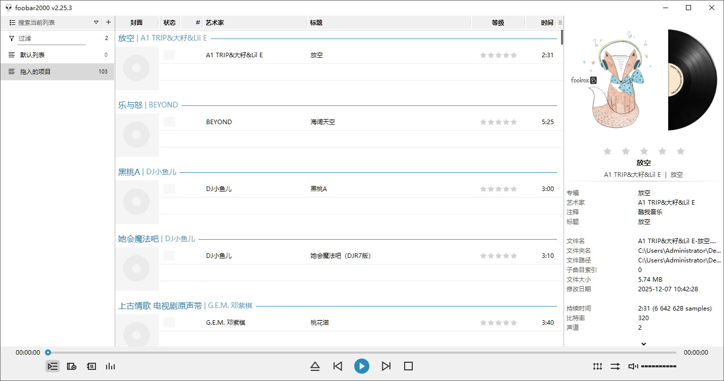 foobar2000 2.25.3 简体中文汉化绿色单文件版是一款备受推崇的 Windows 平台音频播放器,以其高效稳定的性能赢得了广大用户的青睐。该版本不仅继承了原版多格式音频解码和高级标签管理等核心功能,还集成了多种实用插件,极大地拓展了软件的应用场景。无论是日常音乐播放还是专业音频处理,foobar2000 都能为音频爱好者提供流畅而便捷的体验。