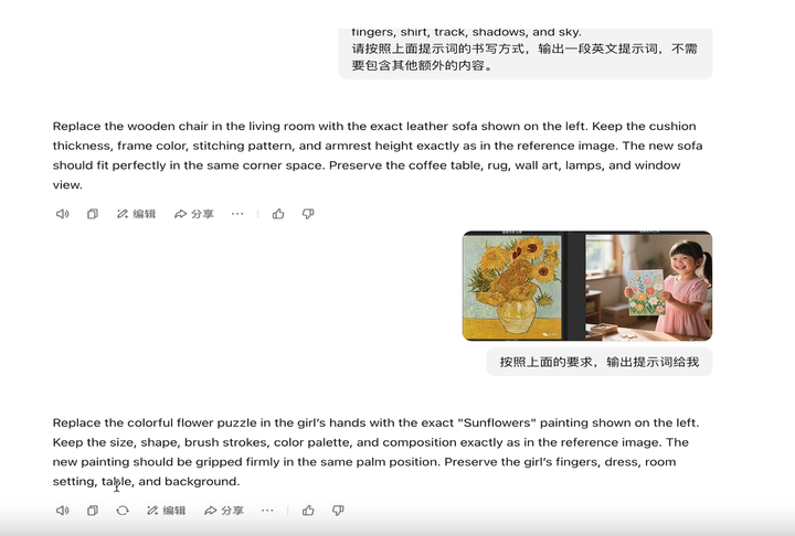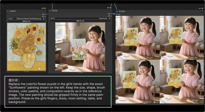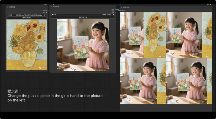 感觉不行,我又重新换了提示词:将女孩手中的拼图换成左侧的图片。