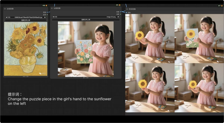 "把女孩手中的拼图换成左侧的向日葵",然后出图变成了这个样子: