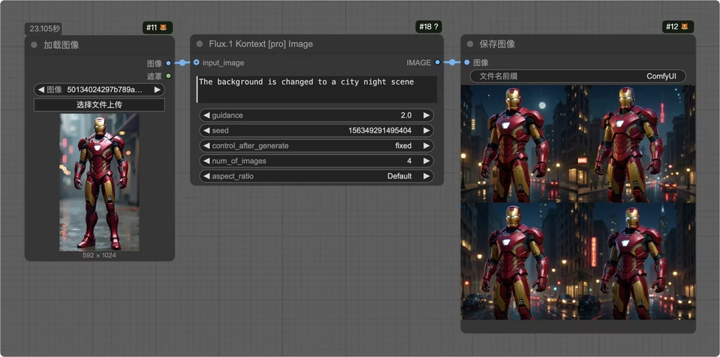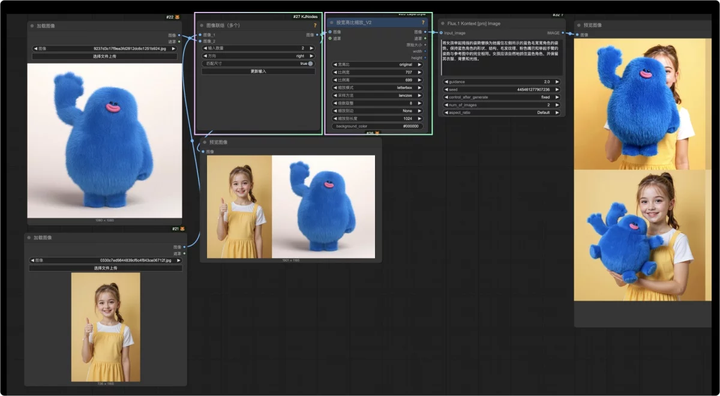 对于需要 2 张图片处理的,比如物品迁移,我们只需要在上述工作流中增加"图像联结(多个)"和"按宽高比缩放_V2"两个节点即可,如下图所示:
