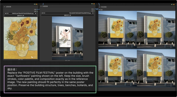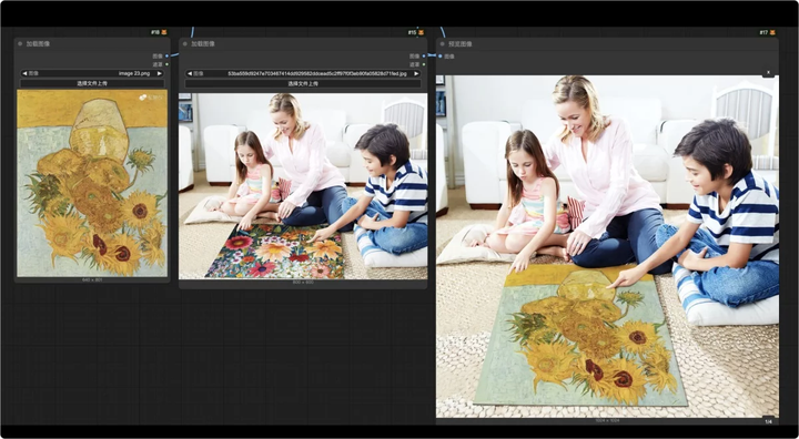 其实通过真实业务场景,会发现 Kontext提示词并没有那么好写,特别是对于复杂的场景,比如下面这个场景,把拼图放在人物场景的画框中,有点不知道怎么写,所以我第一次是这么写的: