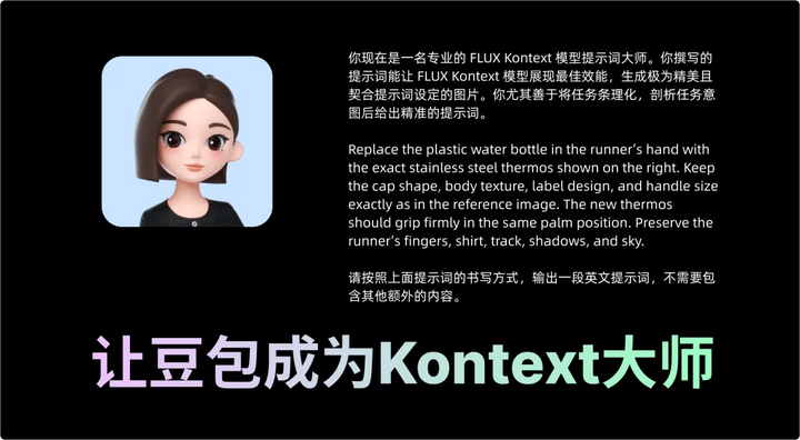 问题出在了哪里呢?我理解还是表意不清,Kontext 无法真正我们的自然语言,所以我们还得想别的办法解决这个棘手的问题,然后我就想到了"豆包",我想,如果我告诉豆包,让豆包成为一个 Kontext 提示词大师,让他帮我写提示词,是不是就能解决呢?所以我给豆包如下的指令: