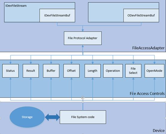 文件协议适配器(fileaccess adapter)负责映射文件访问控制上的(I/O)数据流(DevFileStreamBuf)操作打开、关闭、下溢(UnderFlow)和溢出(Overflow)。
