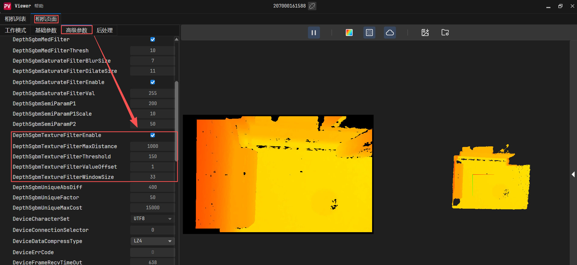 | DepthSgbmTextureFilterMaxDistance | 纹理滤波最大有效距离 | [0,20000] |