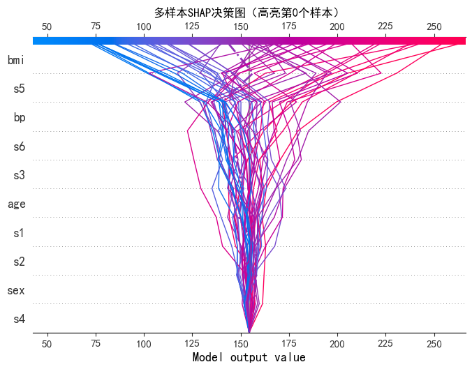 plt.title("多样本SHAP决策图(高亮第0个样本)", fontsize=12)