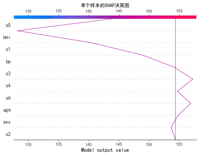 plt.title("单个样本的SHAP决策图", fontsize=12)