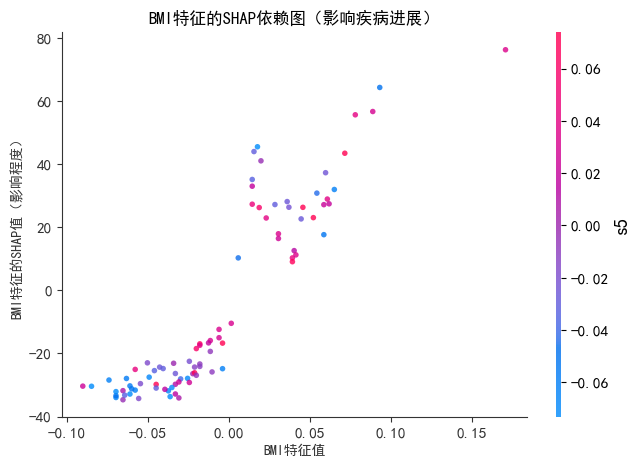 plt.title("BMI特征的SHAP依赖图(影响疾病进展)", fontsize=12)