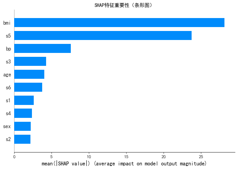 age、s6等):它们的 SHAP 值绝对值更小(影响更弱),但也能看到规律(比如age的蓝色点对应负值,红色点对应正值)------ 特征值高低与 SHAP 值的正负方向一致,但影响幅度远小于bmi和s5。