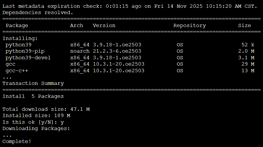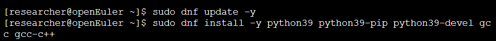 首先,我们通过 openEuler 的包管理器 dnf 安装 Python 3.9 及其开发工具。
