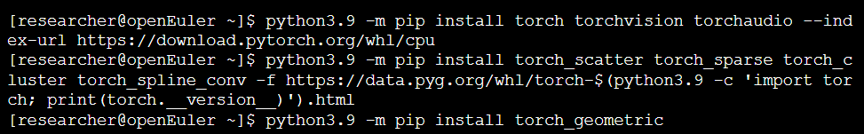 python3.9 -m pip install torch torchvision torchaudio --index-url https://download.pytorch.org/whl/cpu python3.9 -m pip install torch_scatter torch_sparse torch_cluster torch_spline_conv -f https://data.pyg.org/whl/torch-$(python3.9 -c 'import torch; print(torch.version)').html python3.9 -m pip install torch_geometric