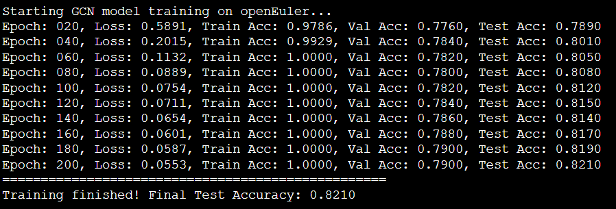 本研究报告通过一个完整的实操案例,系统地展示了在 openEuler 25.03 操作系统上配置环境、处理数据、构建模型、并成功训练一个图神经网络的全过程。实验结果表明,GCN模型在Cora数据集上取得了预期的分类精度,整个开发流程顺畅高效。这有力地证明了 openEuler 作为一个现代、开源的操作系统,完全有能力为图神经网络等前沿AI技术提供稳定、高效、易用的开发与运行平台。对于希望在创新的基础设施上开展AI研究与应用的机构和开发者而言,openEuler 无疑是一个值得信赖和选择的强大基石。